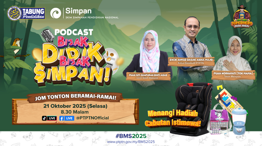 Kupasan santai namun sarat dengan ilmu bermanfaat bersama Encik Ahmad Dasuki Abdul Majid, Ketua Eksekutif PTPTN, dan panel jemputan istimewa dari Tateh Malaysia, Puan Siti Shafurah serta Puan Norhayati (Tok Mama) tentang pengurusan kewangan keluarga, cara mendidik anak menabung sejak kecil serta tip keibubapaan agar setiap langkah anda sebagai ibu bapa menjadi pelaburan berharga untuk masa depan anak-anak.