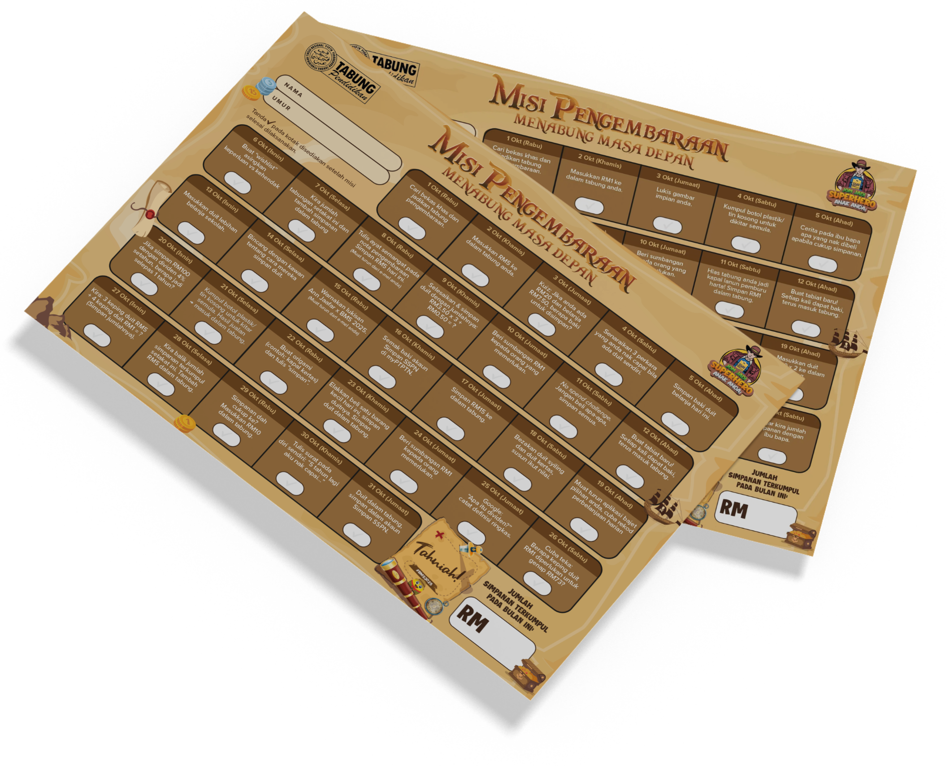 Muat turun Jadual Misi Pengembaraan Menabung Masa Depan dan rekod perjalanan misi menabung anak anda hari ini!