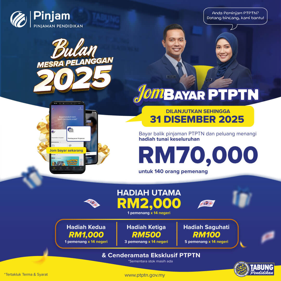Pejabat PTPTN Cawangan akan melakukan pengubahsuaian pejabat dan ditutup sementara bermula 17 Disember 2025 hingga 31 Disember 2025. Pelanggan boleh mendapatkan perkhidmatan di Pejabat PTPTN Negeri Wilayah Persekutuan atau Pejabat PTPTN Cawangan Kajang sebagai pejabat alternatif.